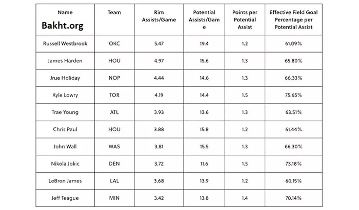 اینجا کیفیت پاسها مورد توجه قرار گرفته است. اینجا همانطور که میبینید، راسل وستبروک، کایل لاوری و جیمز هاردن بهترین عملکرد را داشتهاند. این بازیکنان پوینت گارد هستند. آمار مربوط به وستربوک این است که 61 درصد پاسهای زیر حلقه او که منجر به شوت شدهاند، وارد سبد شدند. وقتی بازیکنی چنین کیفیتی دارد، یعنی این پتانسیل را دارد که بیشتر پاس گلها را در هر مسابقه داشته باشد. او پاسهایی را میفرستد که در شرایط ایدهآل به بازیکن مهاجم میرسند.