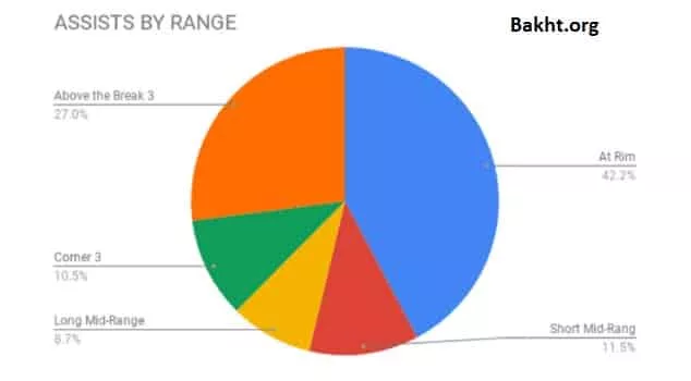 در آمارها ارزش پاسی که منجر به شوت شده در دنیای بسکتبال متفاوت ارزیابی میشود. شوت از نیمدایره 0.8، بیرون فضای سه امتیازی 1.1 و زیر حلقه 1.3 ارزش دارد. در NBA وضعیت پاسها به این صورت است. همانطور که میبینید مقصد بیشتر پاسهای منجر به گل معادل 42.2 درصد در نیمدایره است. کمترین مقدار برای شوتهای از راه دور است که 8.7 درصد را به خود اختصاص دادهاند. در واقع تنها تنها به درصدی که گفته شد، شوتها از پشت نیم دایره وارد سبد شدهاند.