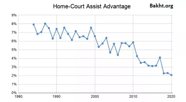 برای دهههای گذشته همواره تفاوت عملکرد تیمها در حوزه پاس گل در خانه و خارج از خانه، چیزی بین 5 تا 8 درصد بود. به طور میانگین به این مقدار در خانه تعداد پاس گل بیشتری داشتند. با این حال طی چند سال اخیر این موضوع کمتر شد. البته در مورد مسابقات سال 2020 متمرکز بودن مسابقات، باعث شد چیزی به اسم مسابقه خانگی معنی نداشته باشد. اما سقوط از سال 2012 به پایینتر از 5 شروع شد. سال 2019 این آمار کمی بیشتر از 2 درصد بود. در واقع ارزش مسابقه خانگی روز به روز کمتر میشود.