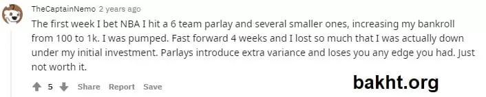 این کامنت کاربری در ردیت است. او گفت: در اولین هفتهای که روی NBA شرط بندی کردم، شش میکس و چند شرط دیگر را برنده شدم. این باعث شد مبلغ کل شرط بندی خودم را از 100 دلار به هزار دلار افزایش دهم. خودم را خالی کردم. چهار هفته بعد همه را باختم و حتی کمتر از چیزی داشتم که در ابتدا داشتم. میکس باعث بالا رفتن احتمال شکست میشود. این باعث میشود هر شانسی که دارید از بین برود. ارزشش را ندارد.