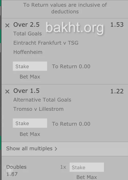 در شماره امروز پست شرط بندی روز، یک میکس شرط بندی که شامل دو بازی می شود را در نظر داریم. به سراغ لیگ آلمان (بوندسلیگا) و لیگ نروژ می رویم. در آلمان روی مجموع بالای ۲.۵ بازی بین دو تیم اینتراخت فرانکفورت و هوفنهایم شرط می بندیم و همزمان، روی مجموع بالای ۱.۵ بازی ترومسو و لیلستروم در نروژ، این کار را انجام می دهیم. ضریب این شرط ۱.۸۷ است اما همان طور که قبلا در شرط بندی حرفه ای گفتیم، شاید در سایت های شرط بندی ایرانی یا خارجی حتی بیشتر باشد. بازی از ساعت ۱۷:۳۰ به وقت ایران آغاز خواهد شد.