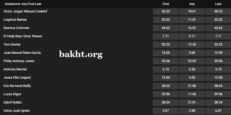 در مورد بالا همانطور که مشاهده میکنید مثلا ضریب زدن گل اول توسط آنتونی مارسیال 5.75، ضریب زدن گل آخر توسط او 5.75 و ضریب زدن یک گل در هر زمان از بازی 2.50 است. این در حالی است که ضریب گلزنی تام دیویس از اورتون 12.26 است.