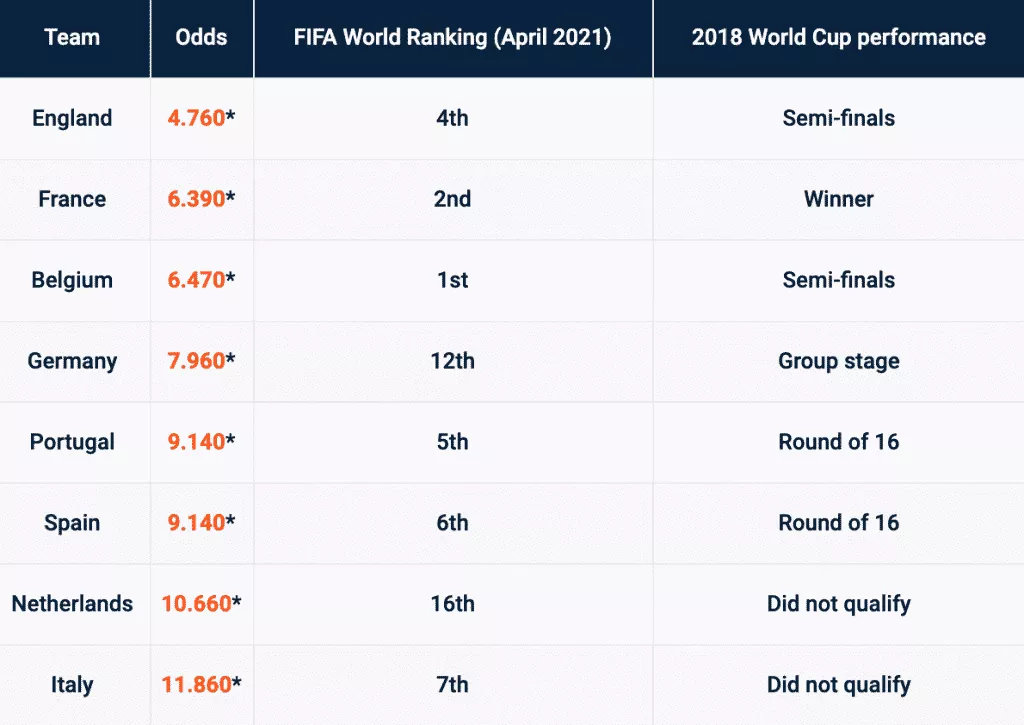 انگلیس در حال حاضر بیشترین شانس قهرمانی را در مارکت شرط بندی فوتبال دارد. بخش قابل توجهی از تورنمنت در خاک انگلیس برگزار میشود و آنها با حضور تماشاگران خودی، شانس زیادی دارند. ترکیب فعلی تیم ملی انگلیس عمق خوبی در هر پست دارد و استعدادهای زیادی در این تیم حضور دارند. تیم ملی انگلیس در مرحله مقدماتی جام ملتهای اروپا نمایش درخشانی داشت و توانست به طور میانگین در هر بازی بیش از ۴ گل ثبت کند. اگرچه گرت ساوتگیت، سرمربی انگلیس در مورد ترکیب نهایی و سیستمی که میخواهد بازی کند دچار شک و تردیدهای زیادی است. رسانههای انگلیس اخیرا وی را به بیش از حد محافظهکار بودن در بازیهای لیگ ملتهای اروپا متهم کردند. انگلیس وابستگی زیادی به کاپیتان خود هری کین دارد. مهاجم تاتنهام در ۱۸ بازی آخرش از سال ۲۰۱۹ برای انگلیس، ۱۴ گل به ثمر رسانده است که آمار قابل توجهی به حساب میآید.