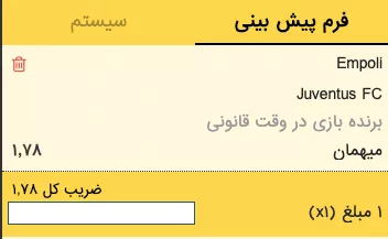 ضریب پیروزی یوونتوس در این بازی بسیار بالا است. چنین گزینه شرط بندی را حتی میتوان در شرط تکی استفاده کرد. مثلا ضریب این گزینه در برخی از سایتهای شرط بندی به ۱.۸۰ هم میرسد. دلیل بالا بودن ضریب این گزینه، عملکرد قابل قبول امپولی در بازیهای خانگی، جریمه اخیر امتیازی یوونتوس از سمت فدراسیون فوتبال ایتالی، بحران مصدومیت در یوونتوس و روحیه پایین بیانکونری بعد از حذف از لیگ اروپا است.