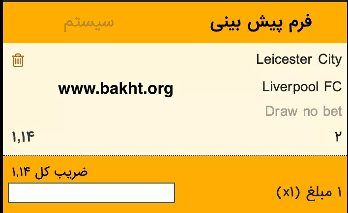 این گزینه شرط بندی در صورتی برنده میشود که لیورپول برنده بازی باشد. اگر بازی با نتیجه مساوی به پایان رسید، مبلغ شرط شما برمیگردد. ضریب این گزینه بسیار کم است و تنها به درد شرط میکس میخورد. در صورتی که دنبال گزینه با ضریب بالاتر هستید، میتوانید روی برد لیورپول شرطبندی کنید. شاگردان یورگن کلوپ باید این مسابقه را ببرند. آنها هفته قبل در جام اتحادیه با تیم دوم توانستند تیم اصلی لسترسیتی را حذف کنند. لسترسیتی چهار مسابقه از پنج بازی آخرش را با شکست تمام کرد. نه مسابقه از ده بازی آخر لیورپول با برد این تیم تمام شد.