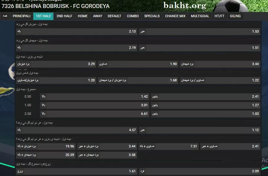 تصویر زیر مربوط به یک بازی لیگ بلاروس، در سایت بت دایجستر است. آنها شرط بندی روی گلزنی تیمها، شانس دو برابر، مجموع، زوج و فرد بودن نتیجه و کامبوی شرط بندی از این نیمه دارند. بسیاری از سایتها گزینههای متنوعتری نیز دارند. برای مثال شرط بندی روی گلزنان در نیمه اول، کرنرها، خطاها و غیره نیز دارند.