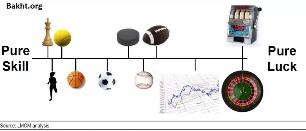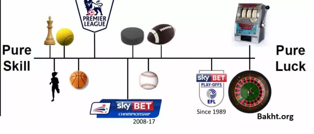 دیاگرام بالا چیزهای جالبی برای گفتن دارد. ماشین اسلات و رولت، قلمروی شانس هستند. اینجا جایی نیست که از مهارت بگویید. بورس نیز با کمی اختلاف، به آنها نزدیک است. اینجا جایگاه قمار است. جلوتر که میآییم، نقش مهارت بیشتر میشود. راگبی، بیسبال و هاکی روی یخ در جایگاههای بعدی قرار میگیرند. بعد جایگاهی میرسیم که فوتبال جا دارد. این اگرچه با بخش مهارت خالص فاصله دارد، نسبت به آن نزدیکتر است تا بخشی که قمار جا میگیرد. بیشترین مهارت برای جایی هستند که شطرنج، دو و میدانی، تنیس و بعد بسکتبال جا گرفتهاند.