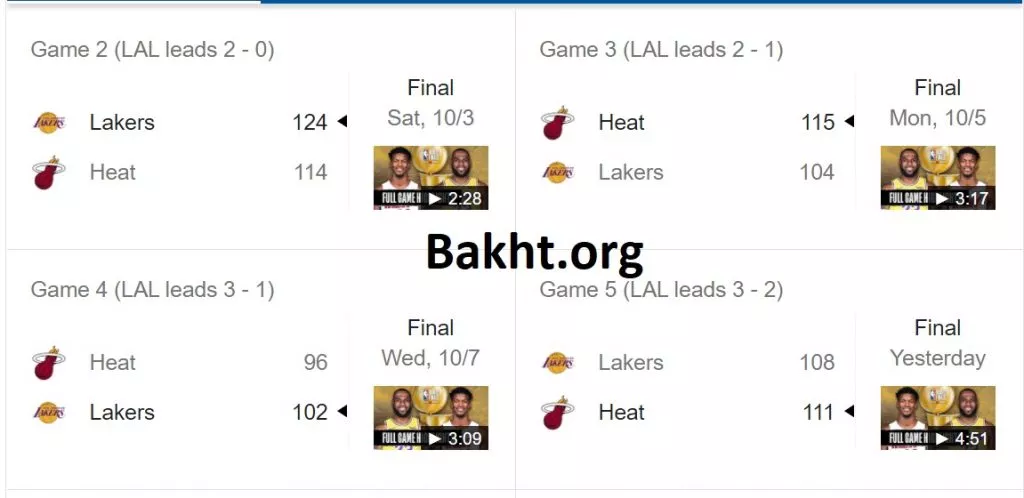 در پنج دیدار ابتدایی دو تیم، در بازی شماری لس آنجلس لیکرز 3-2 از میامی هیت پیش افتاده است و برای قهرمانی نیاز به یک برد دیگر دارد.