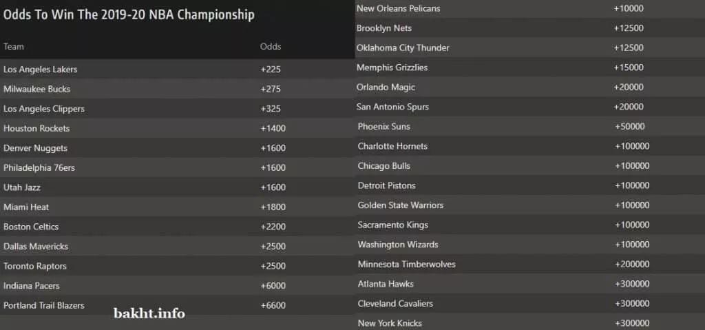 میلواکی باکس و لوس آنجلس لیکرز در جابجاییهایی میان فصل NBA دست نخورده باقی ماندند اما هنوز پرشانسترین تیمها برای قهرمانی در نظر گرفته میشوند. وبسایت شرط بندی بووادا لیکرز که همینک صدرنشین کنفرانس غرب است را با ضریب +225 (بررسی ضرایب شرط بندی) یعنی معادل 3.2 دارای بیشترین شانس قهرمانی NBA معرفی کرد. لیکرز اگر با لبران جیمز و آنتونی دیویس به این مهم دست یابد، برای هفدهمین بار به قهرمانی مسابقات رسیده است. پس از سالهای اوج کوبی برایانت، هیچوقت کسی شانسی برای این باشگاه در نظر نمیگرفت. پس از لیکرز، میلواکی که آمار عالی 44 برد از 51 بازی را ثبت کرده، دومین شانس قهرمانی است. آنها از 1974 تاکنون قهرمان نشدهاند اما ضریب امسال آنها +275 (3.7) است.