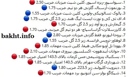 السد-السلیسه. بالای 3.5 گل. 1.65الریان-الدحیل. گلزنی هر دو تیم. 1.60لایپزیش-گلادباخ. برد لایپزیش. 1.50- پاریس-مون پلیه. برد پاریس و بالای 3.5 گل. 1.90