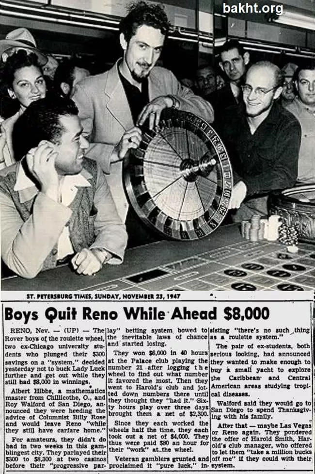 مجله میلواکی ژورنال و ست پترزبورگ تایمس در سال 1947 مطلب یکسانی چاپ کردهاند. در این دو مجله داستان دو دانشجویی روایت شده که با سیستم بازی رولت خود، سیصد دلار را به 8300 دلار تبدیل کردند. اگر این مبلغ را به پول امروزی تبدیل کنیم، معادل 93 هزار دلار است. آنها در اولین امتحان خود نیز شش هزار دلار دیگر برنده شده بودند.