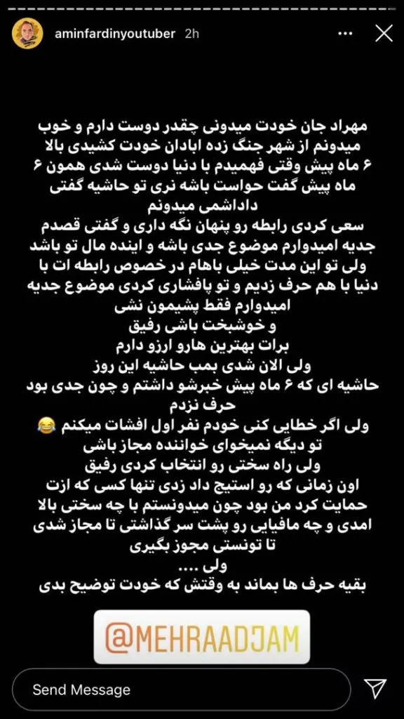 از طرفی امین فردین که پیش از این او را به عنوان فاضلاب یوتیوبی خدمت شما معرفی کرده بودیم و خود را افشا کننده خبرهای سلبریتی ها معرفی میکند با انتشار استوری خطاب به مهراد جم گفته که 6 ماه است از رابطه او با جهانبخت خبر دارد.