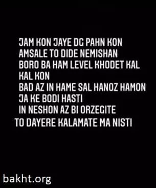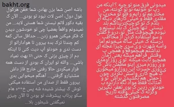 تو کلا تو عمرت 5 دقیقه منو دیدی بچه جون. بعد تو همین 5 دقیقه بیت باکس زدی و من از ریتم افتادم؟ انقدر دروغ نباف راه گنده شدن این نیست. چارتا کار مشتی بده شما هم دیده میشی. در ضمن ما رفاقتی هم با هم نداشتیم که تعیین تکلیف می کنی و میگی واسه رفقا بد میشه. اون موقعی که ما رپ می خوندیم تو هنوز هوس بودی تو ذهن بابات. حواست به خودت باشه.