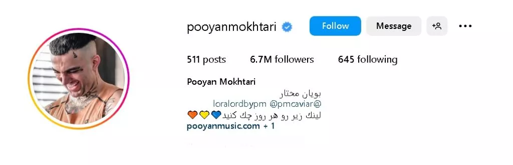 اینستاگرام پویان مختاری در حال حاضر 6.6 میلیون دنبال کننده دارد.