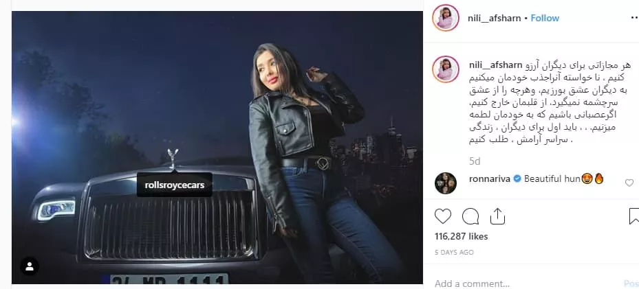 پویان مختاری مدیر سایت شرط بندی حضرات اکانت فعالی در اینستاگرام دارد. همینطور همسر او نیلی افشار نیز، بسیار در این شبکه اجتماعی فعال است. با این حال این زوج که از شرط بندی به ثروت رسیدهاند، دائما در حال به رخ کشیدن پول خود هستند. پیش از این، ماشین های سابق پویان مختاری را برای شما لیست کرده بودیم و حالا آنها خودروی رولز رویسی خریدهاند (Rolls-Royce Dawn) که نشانی از آن را در هر پست اینستاگرامی آنها میبینید. حتی به نمایش در آوردن ماشین کفایت نمیکنند و دائما اکانت این کمپانی را در اینستاگرام تگ میکنند که مبادا اسم این خودرو از قلم نیفتد. این خودرو در حال حاضر 346 هزار دلار یعنی 3.8 میلیارد تومان ارزش دارد.