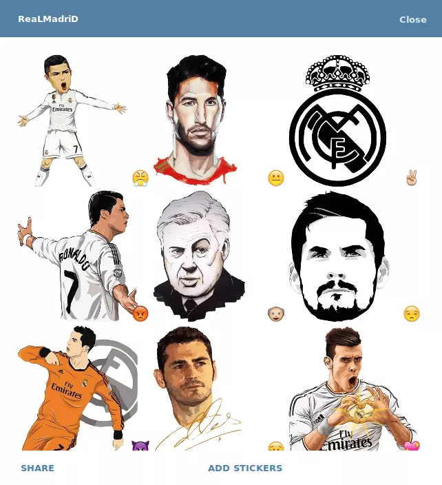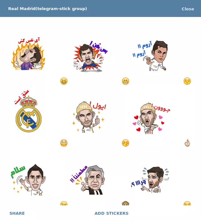 اگر در گروههای تعاملی فوتبالی یا شرط بندی عوض هستید، برای شروع بحث یا مشارکت در بحثهای فوتبالی استفاده از استیکرها بسیار مفید است. در ادامه چند بسته استیکر تلگرامی برای هواداران تیم رئال مادرید را معرفی میکنیم.