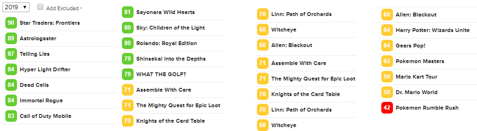 این لیست، براساس رده بندی سایت معتبر MetaCritic مرتب شده است که میتوانید لیست کامل آن را در ذیل ببینید: