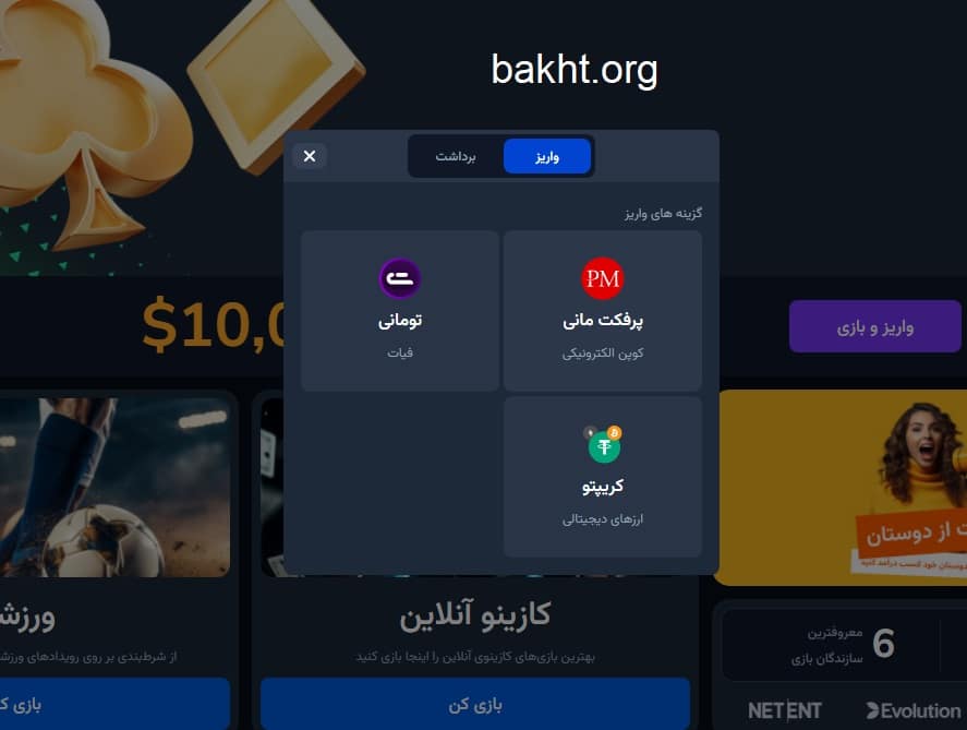 برای واریز میتوانید از روشهای موجود که شامل پرفکت مانی، کریپتو و درگاه ریالی هستند استفاده کنید.