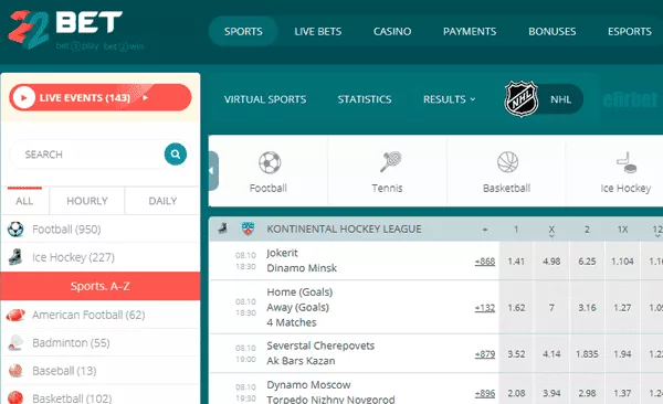 در سایت شرط بندی 22bet هر روزه هزاران رویداد ورزشی مختلف برای پیش بینی ارائه میگردد. ورزشهای بی شماری در این سایت وجود دارد که میتوانید روی آنها شرط بندی کنید. این ورزشها عبارتند از: