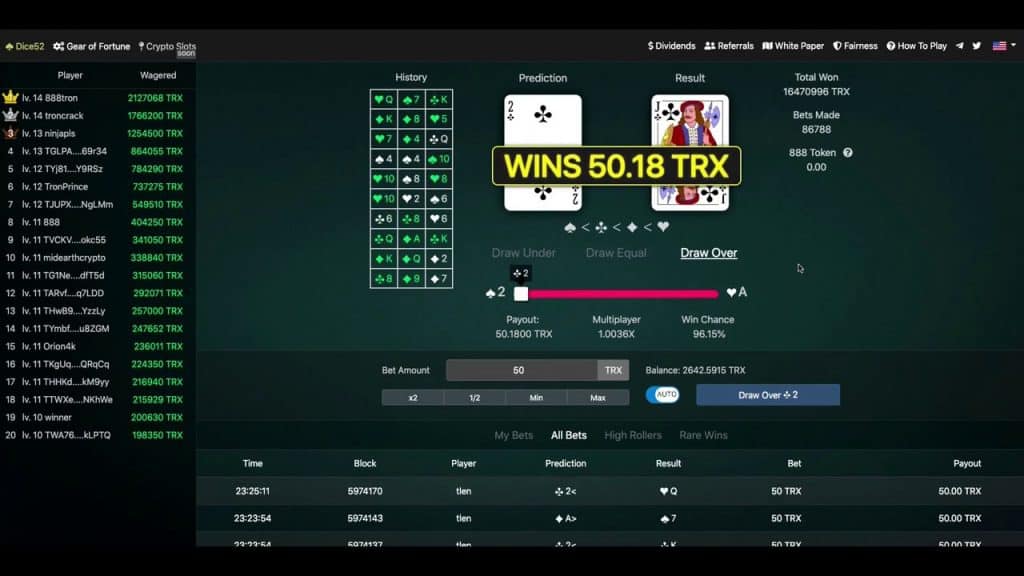 در حال حاضر سایت به کاربران سه بازی جذاب را پیشنهاد میدهد. اولین بازی تاس۵۲ (DICE52) است. این بازی یک نوع بازی تاسی با استفاده از پاسور است. بازیکنان در این بازی باید پیشبینی کنند که کارت بعدی از کارت فعلی بیشتر، کمتر و یا حتی یکی است. ضرایب و شانس هر نوع انتخاب در سایت به شما نشان داده میشود. به همین دلیل میتوانید پیشبینی آگاهانهای را تجربه کنید. بازی به سرعت و آسانی در سایت اجرا میشود که این به واسطه بلاکچین ترون است. رابطه کاربری بازی هم جذاب است.