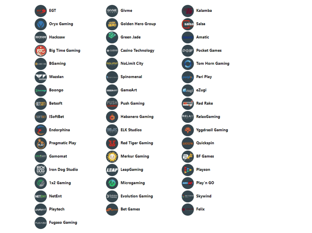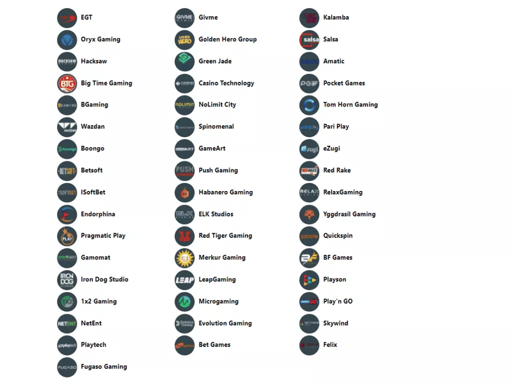 لیست زیر تمامی ارائه دهندگان نرم افزاری را که در این سرویس شرط بندی بازی ارائه میدهند را پوشش میدهد: