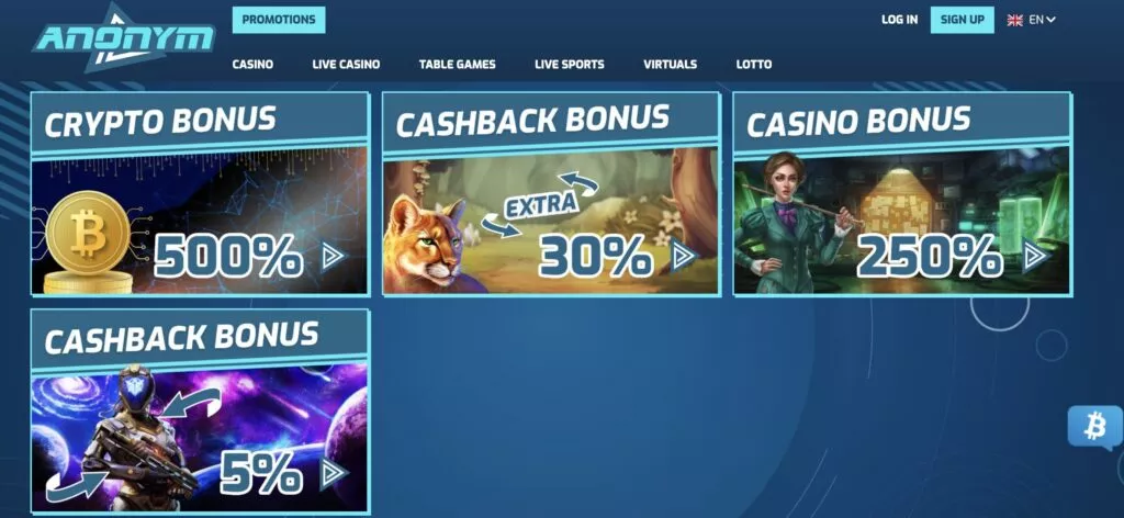 وب سایت کازینو انونیم بت به همه کاربران خود یک بونس شگفت انگیز میدهید. اینکه میزان بونس شما به چه میزان است بستگی به این دارد که بازیکن جدید یا قدیمی هستید. برای مشاهده بونسهایتان به بخش بونس در حساب کاربری خود بروید. در زیر برخی از بونسهای موجود در وب سایت را توضیح دادهایم: