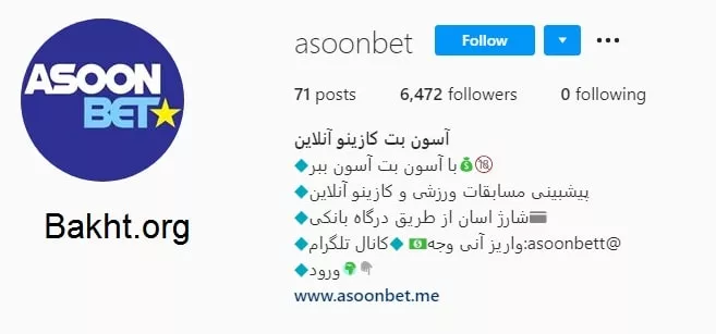 سایت شرط بندی آسون بت در اینستاگرام و تلگرام حضور فعالی دارد. آسون بت در اینستاگرام بیشتر از 6 هزار دنبال کننده دارد. کانال تلگرام آسون بت حدوداً هزار عضو دارد.