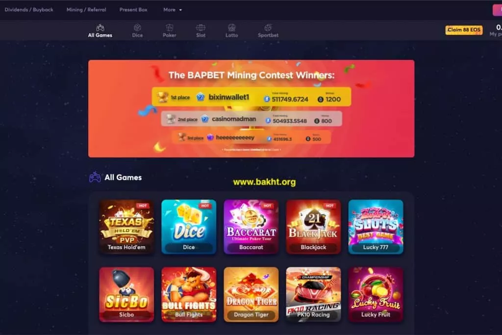 سایت شرط بندی باپبت، یکی دیگر از سایتهای مطرح شرط بندی بلاکچینی در حوزه ایاس است. باپبت برای واریز و برداشت جایزه از توکن EOS استفاده میکند که در هجده ماه اخیر در دنیای ارز دیجیتال به شهرت زیادی رسیده است. نام اصلی سایت از ترکیب عبارت Bet and Profit تشکیل شده که به معنی شرط ببند و سود کن است. باپبت توکن اختصاصی خود را دارد که هرچقدر بیشتر مورد استفاده قرار بگیرد و تعداد کاربران بیشتر شود، میتواند ارزش بیشتری هم داشته باشد. بازیهای سایت در چند بخش تاسی، ماشین اسلات، بازیهای کارتی و پیش بینی ورزشی تقسیم میشوند. در بخش بعدی، در مورد هر کدام بیشتر توضیح خواهیم داد.