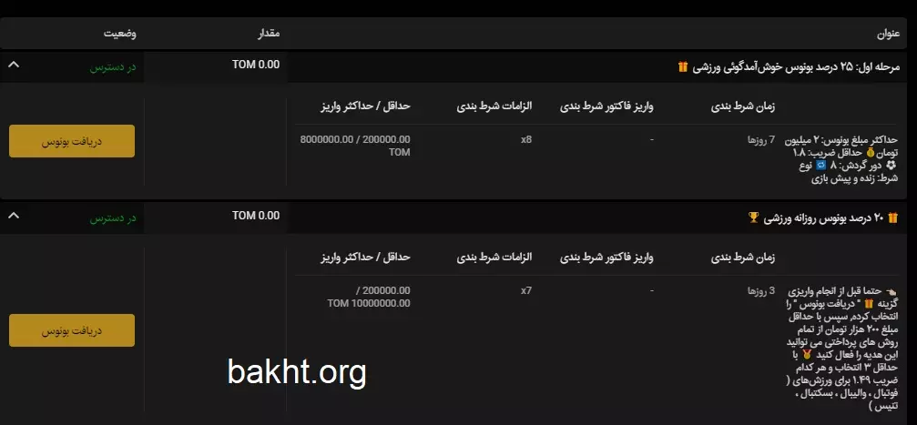حداکثر مبلغ بونوس شرط بندی در بخش ورزشی، 2 میلیون تومان است و باید 8 دور آن را روی فرم با ضرایب حداقل 1.8 به گردش در بیاورید.