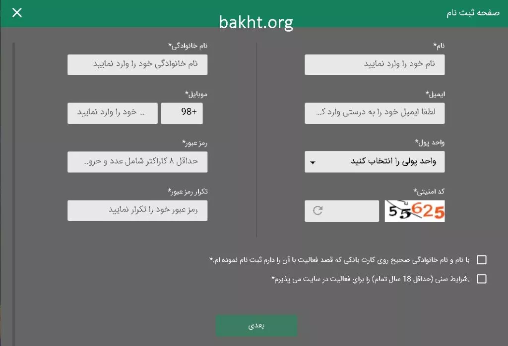 نام، نام خانوادگی، ایمیل، موبایل، واحد پولی و رمز عبور