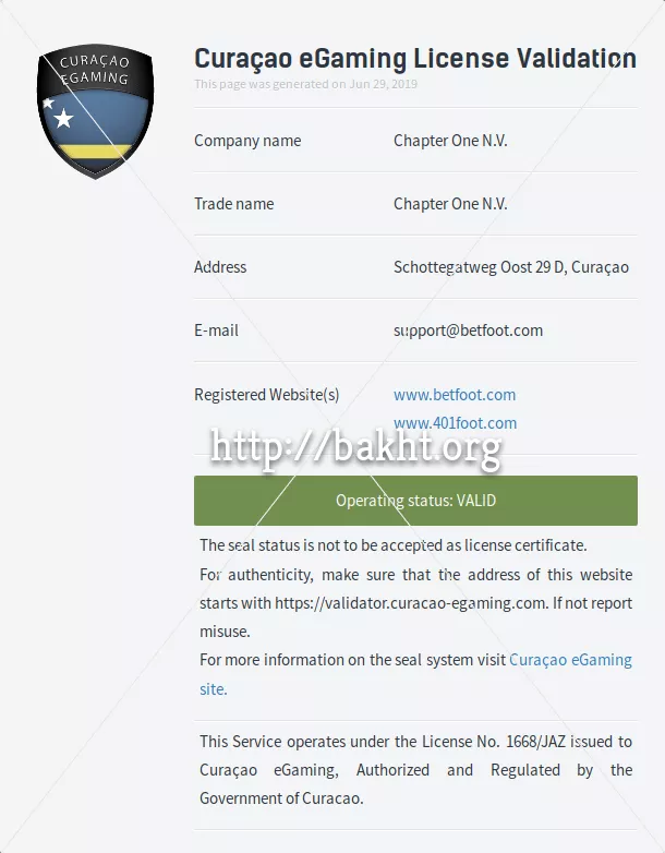 در پایین-سمت راست سایت بت فوت لوگوی اعتبار سنجی Curaçao eGaming قرار دارد. با کلیک روی آن صفحه تایید هویت سایت بت فوت را مشاهده خواهید کرد. این لوگو همانند اینماد نشان دهنده اعتبار این سایت در کشور هلند است.