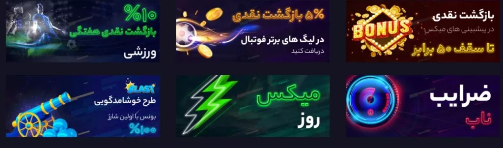 در لیگهای فوتبال هم 5 درصد بازگشت نقدی برای پیش بینی مسابقات در نظر گرفته شده است. باید به این نکته توجه داشت که با توجه به مناسبتهای مختلف بونوسهایی ارائه میشود.