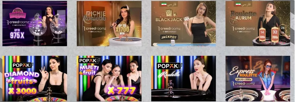 در بخش کازینو زنده، بازیهای مختلف با دیلر زنده به زبانهای عربی، ترکی، فارسی، انگلیسی و اسپانیایی ارائه میشود. کازینو ایزوگی، لاکی استریک، ویوو گیمینگ از جمله توسعه دهندگانی هستند که کازینو زنده این سایت را پشتیبانی میکنند.