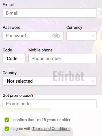 برخلاف سایر وب سایتهای شرط بندی، فرم ثبت نام ظاهر نمیشود. در عوض یک منو کشویی به شما نشان داده میشود. در این منو باید ایمیل، رمز عبور، کشور و شماره تلفن همراه وارد کنید.
