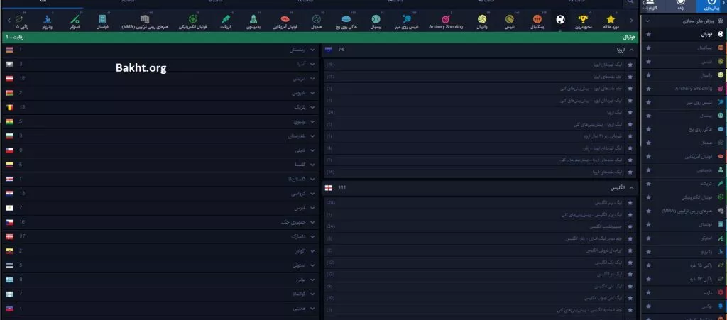 پیش از این به طور اختصاصی به موضوع شرط بندی فوتبال در سایت بترین پرداختیم. بخش شرط بندی ورزشی بترین بسیار بزرگ و وسیع است. نمایی از آن را در زیر میبینید. در منو سمت راست، ورزشها و یک سری موارد مشابه را میبینید. منظور از موارد مشابه، چیزهایی مانند انواع بازیهای eSports است که برای هرکدام دسته بندی مادر معرفی کردهاند. مجموعه مورد اشاره در کل حدود پنجاه زیرمجموعه دارد. لیگ مجازی فوتبال و یک سری ورزشهای مجازی دیگر نیز برای شرط بندی دارند تا مجموعهای وسیعتر داشته باشند. چیزهایی نظیر شرط بندی روی مسابقات کشتی کچ، کشتی سومو، سیاست و فیلمها و سریالها نیز در لیست دارند که جالب توجه است.