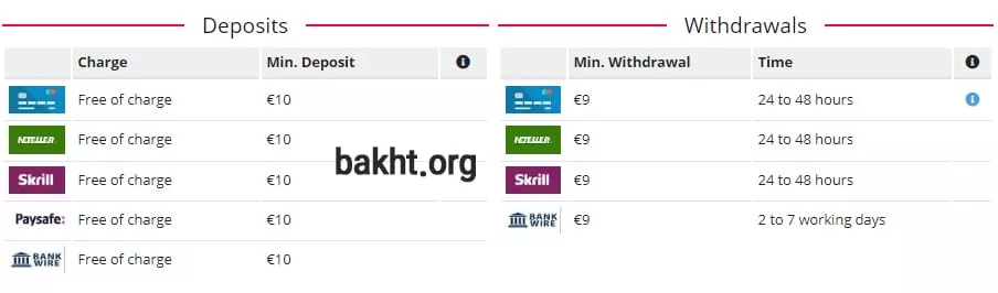 برای برداشت از حساب کاربری هم، روش های شارژ حساب در دسترس هستند. حداقل مبلغ برای برداشت 9 یورو است و ممکن است از 24 ساعت تا 7 روز به طول بیانجامد.