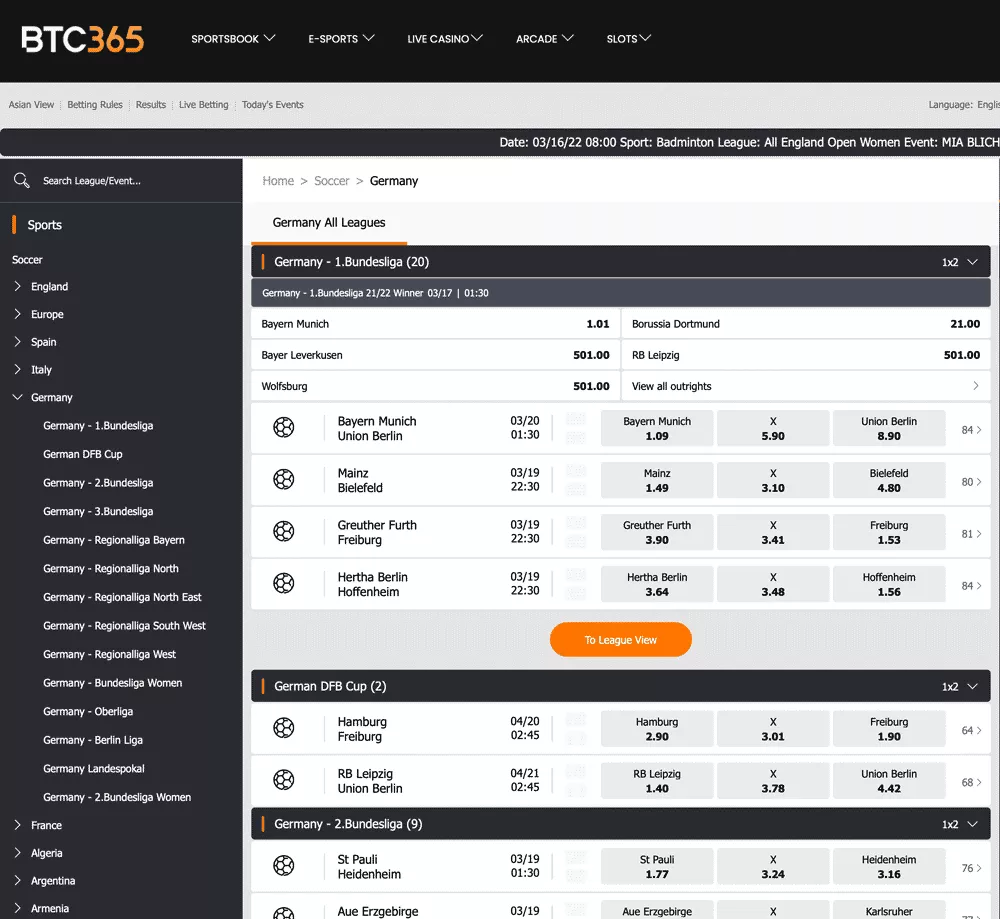 شرط بندی فوتبال، محبوبیت زیادی بین کاربران سایت دارد. تمام گزینههای شرط بندی برای هر بازی فوتبال فعال است. بیتیسی ۳۶۰ برای آربیتراژ، گزینهها را محدود نمیکند. این مسئله خبر خوبی برای کسانی که با ضریب کم شرط بندی میکنند، است. امکان انتخاب چند گزینه از یک بازی وجود دارد. همچنین محدودیتی برای شرط میکس در سایت وجود ندارد. قسمتی به عنوان vip در سایت تعیین شده که به ازای هر برد در شرط، مبلغ بیشتری به شما داده میشود.