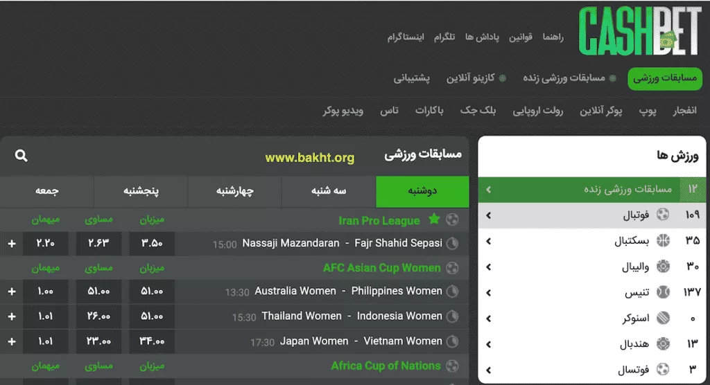 نوار بالای منوی سایت به بخش پیش بینی ورزشی اختصاص دارد. امکان پیش بینی زنده هم در سایت دیده میشود. در صورتی که بازی مورد نظر شما شروع شده، میتوانید از این قسمت آن را پیدا کنید. اسم تیمها به انگلیسی است و ترجمه نیست. به همین دلیل در بخش جستجو باید اسم انگلیسی را وارد کنید. لیگ ایران به صورت دیفالت در بالای صفحه دیده میشود. همچنین میتوان تا مسابقات ورزشی چهار روز آینده را پیش بینی کرد.