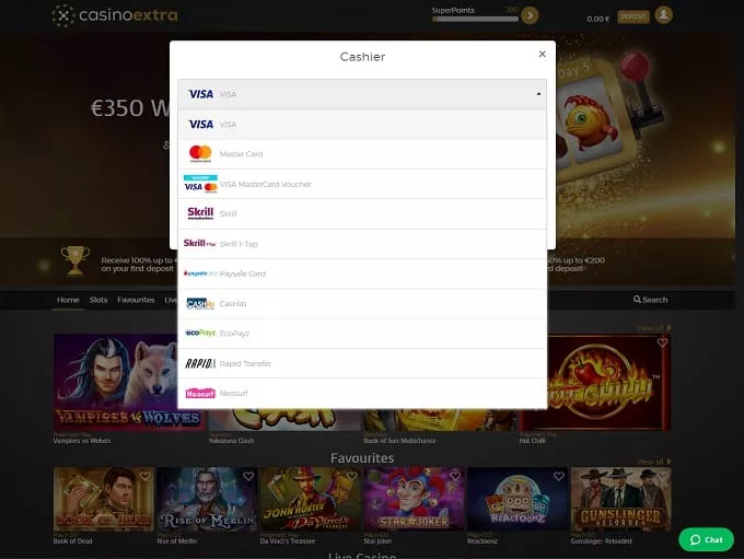 شارژ حساب در کازینو اکسترا از طریق انواع مختلف کارتهای اعتباری (از جمله ویزا و مستر کارت) و سایر درگاههای پرداخت مانند Skrill، Neteller و PaysafeCard امکان پذیر است.