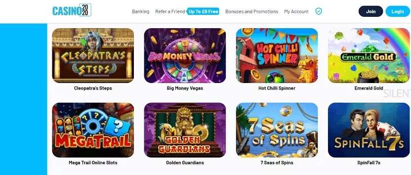 در میان اسلاتهای برتر Casino2020 که اپراتور ارائه میکند میتوان به Amityville، Shield of Egypt، Viking Lightning Spin، Hot Chilli Spinner، Raging Bull، Thunderlords و موارد دیگر اشاره کرد.