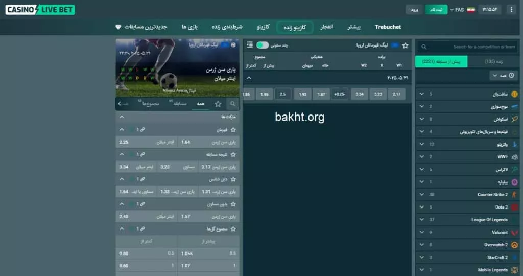 همچنین دهها نوع بازی الکترونیکی از جمله Dota 2، بازی کانتر و Overwatch 2 در این بخش در دسترس هستند. پس از انتخاب رشته ورزشی، رویدادهای مرتبط با آن نشان داده میشود که میتوانید آن را انتخاب کنید و در ستون سوم گزینههای شرط بندی را ببینید.