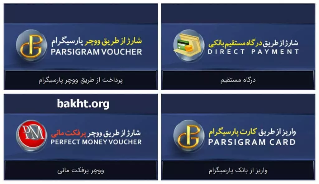 برای شارژ حساب کاربری در سایت چیل بازی، از طریق درگاه مستقیم بانکی ایرانی، ووچر پارسیگرام و پرفکت مانی میتوانید اقدام کنید. همچنین از طریق بیت کوین نیز حساب کاربری در سایت چیل بازی قابل شارژ است.