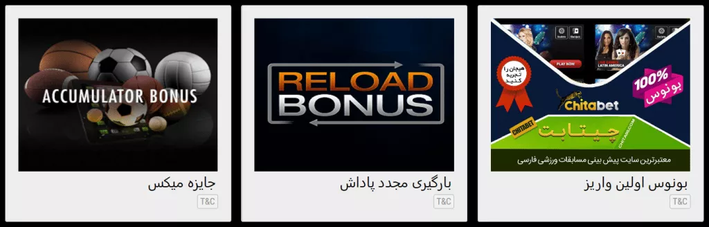 بونوسهای سایت چیتا بت شامل بونوس اولین واریز، واریز از طریق پرفکت مانی و ارزهای دیجتال، بارگیری مجدد پاداش و جایزه میکس است. برای آگاهی از بونوسهای فعال به بخش طرحهای ویژه در سایت چیتا بت مراجعه کنید.