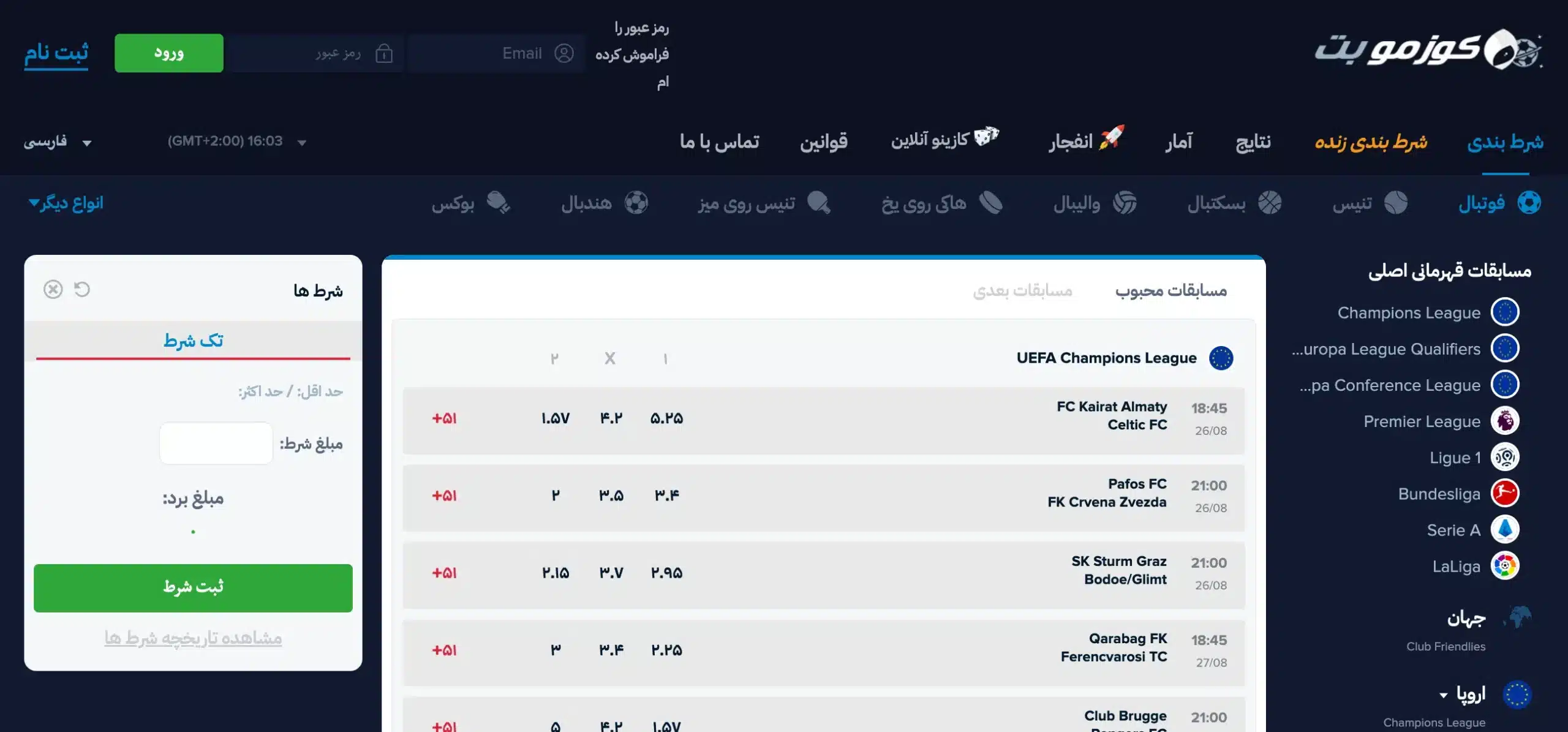 کوزمو بت یکی از سایت های شرط بندی بین المللی و خارجی است که از زبان فارسی نیز پشتبانی میکند. کوزمو بت بخشهای مختلفی از جمله پیش بینی و کازینو آنلاین دارد.