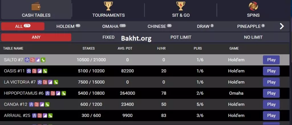 انواع بازی پوکر از جمله پوکر اوماها، پوکر تگزاس هولدم، پوکر چینی در این سایت قابل دسترس است و در تورنمنتهای مختلف با جوایز متفاوت قابل بازی کردن است.