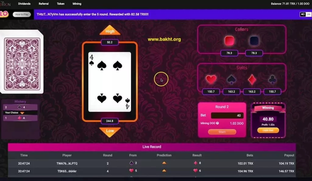 سایت شرط بندی دوترون، یک کازینوی آنلاین بر پایه توکن ترون است. شما در این سایت تنها با این رمزارز سروکار خواهید داشت. به همین دلیل بهتر است قبل از هر چیزی کیف مخصوص را دانلود کنید و بسازید. دوترون شاید یک بازی کازینو داشته باشد، اما این بازی به طور جالبی طراحی شده و میتواند نظر خیلی از کاربران را جلب کند. سایت طراحی بسیار سادهای دارد و شما در همان صفحه اصلی میتوانید وارد بازی شوید. متاسفانه امکان بازی آزمایشی در دوترون وجود ندارد و تنها با توکن ترون ممکن است. بخش واریز و برداشت جوایز هم از طریق ترون انجام خواهد شد.
