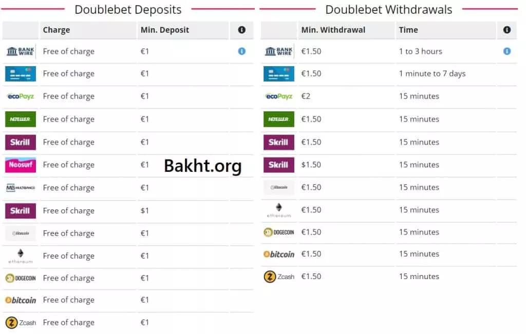 برای شارژ حساب در سایت دابل بت از روش های متنوعی استفاده میشود. امکان شارژ با استفاده از بیت کوین نیز وجود دارد. حداقل مبلغ برای شارژحساب 1 یورو است که به نسبت سایتهای مشابه بسیار پایین است.
