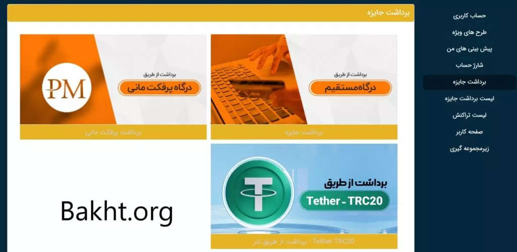 برای برداشت جوایز هم امکان برداشت از طریق شبا، پرفکت مانی و ارز دیجیتال تتر وجود دارد. باید توجه کنید که به همان روشی که واریز کرده اید، میتوانید برداشت هم انجام دهید.