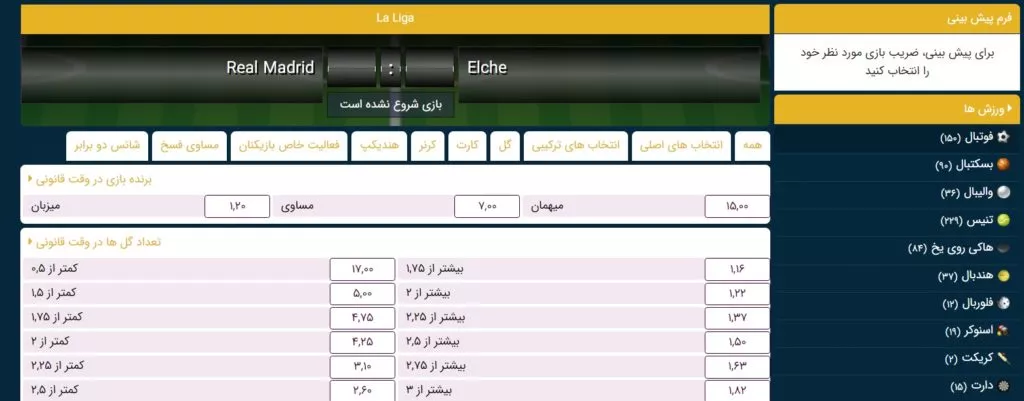 امکان پیش بینی کرنر، خطا، بالا/پایین، کارت زرد و .. وجود دارد. برای هر رویداد ورزشی معتبر بیشتر از 100 آپشن و گزینه برای شرط بندی در نظر گرفته شده است.