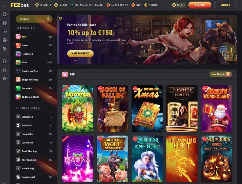 FezBet یک لیست طولانی از دستهبندیهای بازیها در منوی سمت چپ خود دارد.